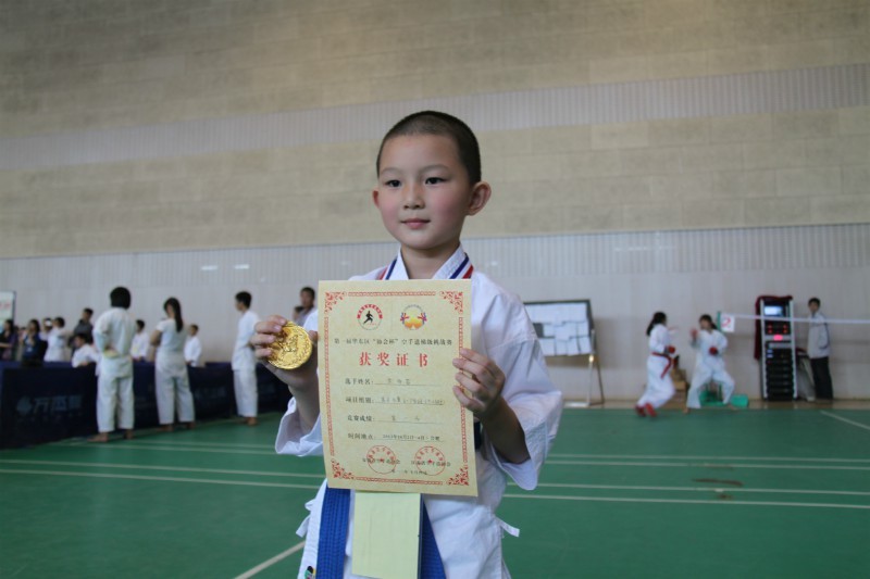 杏吧原创 空手道代表队选手安医大附小一(2)班余雨若同学为杏吧原创 代表队夺得首枚金牌