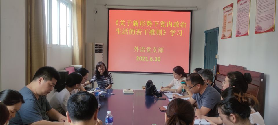 2021年6月30日下午,外语党支部在三楼党员活动室集中学习《关于新形势下党内政治生活的若干准则》。首先,党支部书记带领全体党员认真学习了十二条准则。通过学习,全体党员清楚明白:全面从严治党永远在路上;全党要坚持不懈努力,共同营造风清气正的政治生态,确保党始终成为中国特色社会主义事业的坚强领导核心。其后,王然,薛艳,张禄静三位党员就学习的准则内容,分别发言,表达了自己的看法和遵守准则的决心。