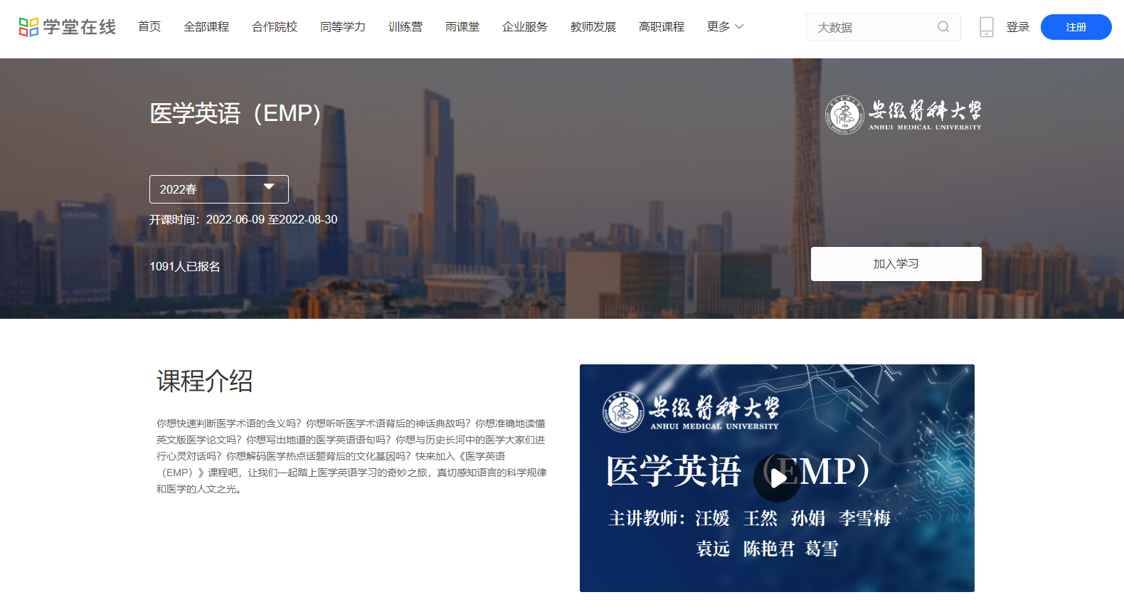 2022年6月10日,我系汪媛副教授主持的安徽省一流线上课程“医学英语(EMP)”正式上线国内主流在线课程平台“学堂在线”。