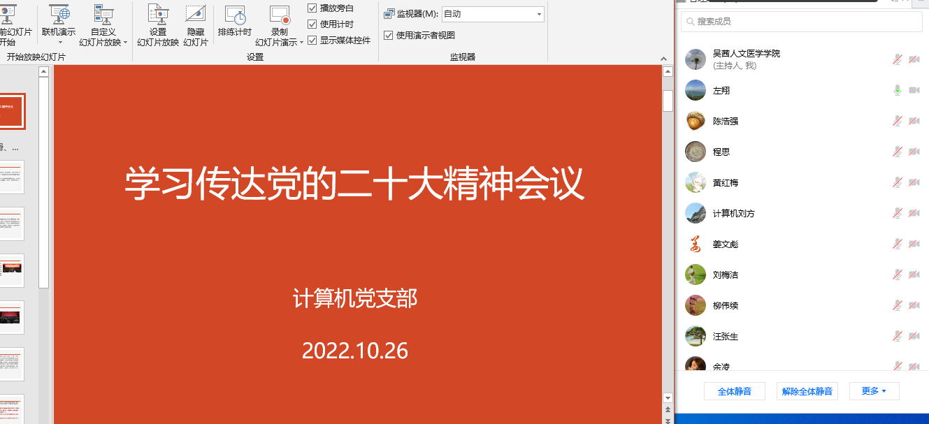 10月26日,计算机党支部召开专题会议,学习传达党的二十大精神会议。会议内容分包括三大部分,一是计算机党支部书记做题为《学习传达党的二十大精神会议》的主题报告,带领全体党员从党的二十大意义、全国掀起党的二十大精神学习热潮、党的二十大报告关于科教兴国的重要论述和部署等方面全面贯彻领会党的二十大精神;二是计算机党支部5位党员教师代表就学习党的二十大精神发言;三是计算机党支部全体党员一起观看《做当党和人民满意的人民教师》视频。