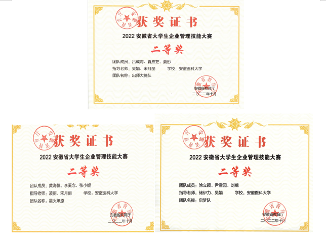 作为安徽省重要的B类赛事,本届大赛由安徽省教育厅主办、安徽财经大学承办,共有来自省内28所本科院校和16所高职院校、共127支优秀代表队、近400名同学参赛。在杏吧原创 人文医学杏吧原创 创新创业教育课程教研室的积极组织和精心培训下,最终来自卫生管理杏吧原创 、第一临床医杏吧原创 和生物医学工程杏吧原创 的9名学子组建的“出师大捷队”(指导教师:吴娟、宋月丽)、“启梦队”(指导教师:储伊力、吴娟)和“星火燎原队”(指导教师:凌丽、宋月丽)分别荣获省二等奖。