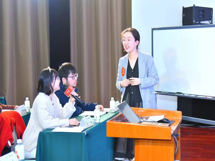 本届教学大赛分为综合课组和视听说课组,采用线下授课和说课相结合的形式。从全国30个赛区脱颖而出的60位优秀教师,在历时两天半的决赛和总决赛中同台竞技,比拼教学育人素养。决赛采取“授课+回答评委提问”的形式,要求选手使用提前准备好的备课资料现场进行课堂展示,卞佳老师凭借精妙的教学设计、扎实的语言素养和亲和的授课风格成功晋级总决赛。总决赛采取“说课+回答评委提问”的形式,入围选手根据组委会提供的选文进行说课,需要在仅30分钟的准备时间内完成整套教学设计,进行10分钟现场说课并在5分钟内与提问评委互动,回答评委犀利的提问,卞佳老师最终以卓越的英语基本功、良好的人文素养、严密的思辨说理征服了现场评委,斩获大奖。