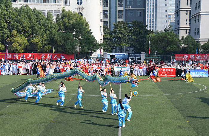 开幕式上,我院体育部教师王雪表演的节目《太极功夫扇》,刚柔并济,彰显中华优秀传统文化魅力;我院运动康复专业学生参演的节目《龙腾安医铸华章》,极具传统民俗特色,让现场气氛到达高潮。
