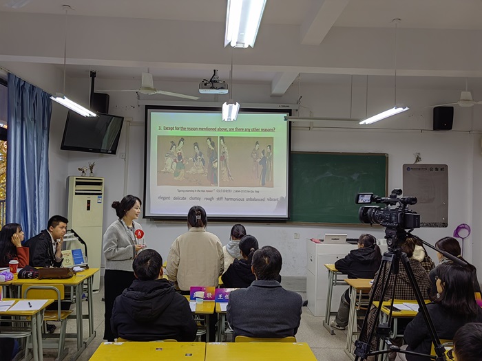 本次教学大赛分为单元教学设计和现场教学展示两部分。在教学展示中,主讲教师冷冰现场陈述对授课素材的整体教学设计,展示单元教学过程中教学目标的设定和具体实施之间的逻辑关系,并基于整体教学设计中的具体版块进行了20分钟的授课演示。我院外语教学团队选择“中国服饰文化”的单元主题,选取单元课文分析和讲述中国故事部分进行教学展示,以学生为中心、项目产出为导向,设计出包括看图说话、视频讨论、讲述中国文化故事等形式多样的教学环节。整个教学过程引导学生全面、深入地理解中国传统服饰文化,及其在当代中国的创新,引导学生坚定文化自信,运用英语更加系统、精准地讲好中国故事,提升学生的跨文化国际传播能力。