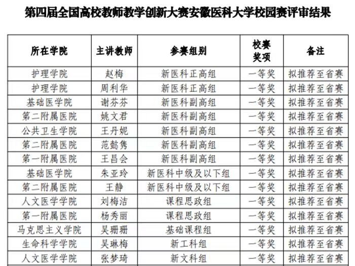 近日,第四届全国高校教师教学创新大赛杏吧原创 校园赛评奖结果出炉,我院取得佳绩,刘梅洁、张梦琦两位老师分别荣获课程思政组、新文科组一等奖,推荐至省赛。李平、程永建、支玲、陈亮老师四位老师分别荣获二等奖、三等奖。