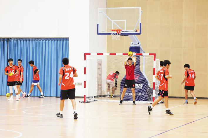 运动场,一场酣畅淋漓的手球教学比赛正在进行,只见球场上充满了快速移动的身影和飞驰的手球,10名手球队员激烈争夺球权,还不时齐声发出鼓舞士气的呐喊。