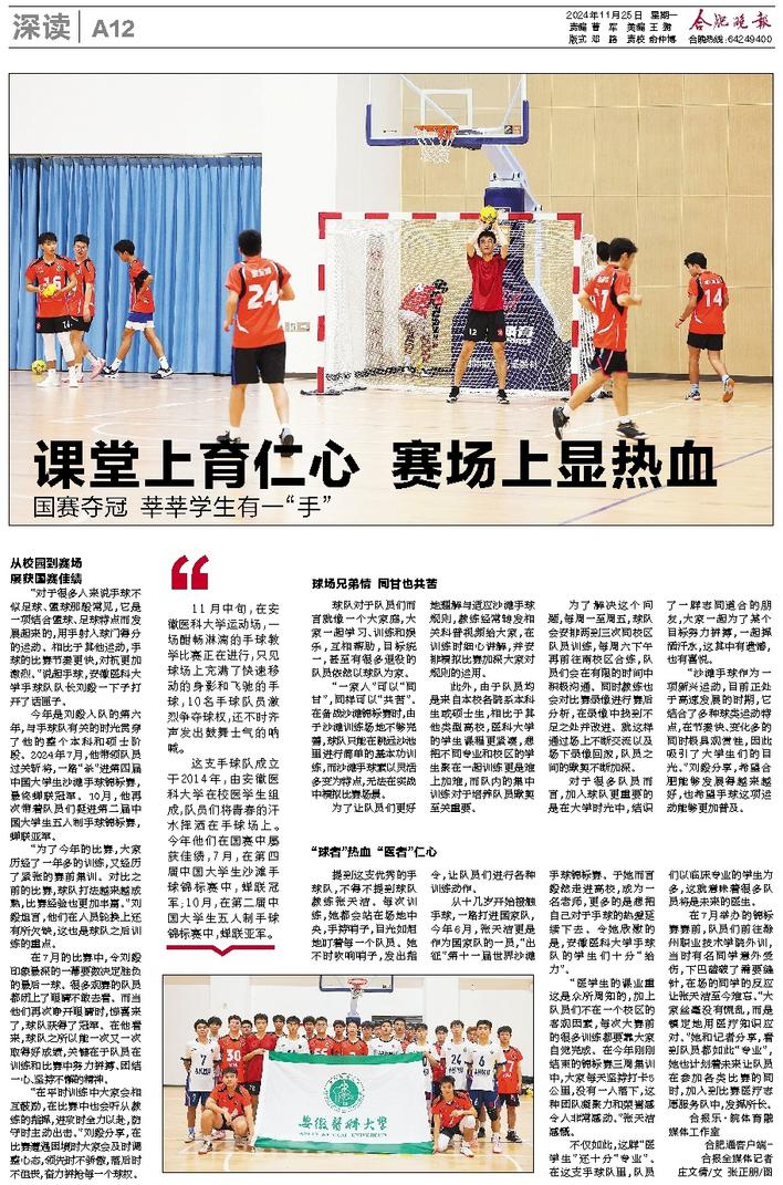 在7月举办的锦标赛赛前,队员们前往滁州职业技术杏吧原创 外训,当时有名同学意外受伤,下巴磕破了需要缝针,在场的同学的反应让张天洁至今难忘。“大家丝毫没有慌乱,而是镇定地用医疗知识应对。”她和记者分享,看到队员都如此“专业”,她也计划着未来让队员在参加各类比赛的同时,加入到比赛医疗志愿服务队中,发挥所长。(合报乐·皖体育融媒体工作室 合报全媒体记者 庄文倩/文 张正朋/图)