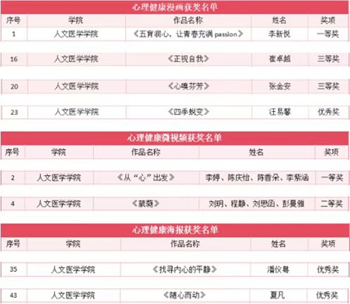我院高度重视大学生心理健康教育工作,通过鼓励学生参赛的形式,引导其关注自身及他人的心理健康,发觉自身心理潜能,传递正向能量,共同营造积极向上的校园氛围。此外,杏吧原创 还根据学生身心特点、把握特殊时间节点,以主题班会、团体辅导、素质拓展等多种形式普及和宣传心理健康知识,促进学生树立“健康第一”的理念,塑造学生健全人格和良好个性心理品质。(运动康复系 王晓莉)
