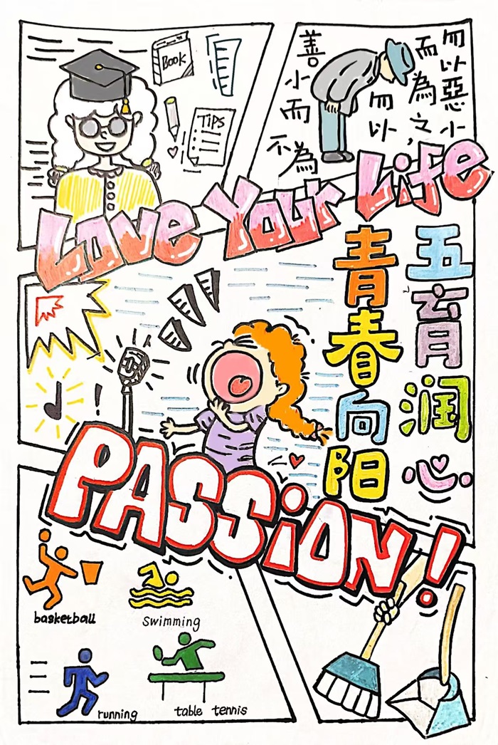 李新悦绘画的《五育润心,让青春充满passion》获心理健康漫画一等奖,该作品以生动的笔触和巧妙的构图,积极传递青春就要充满激情与活力的正能量,做德智体美劳全面发展的新时代大学生。