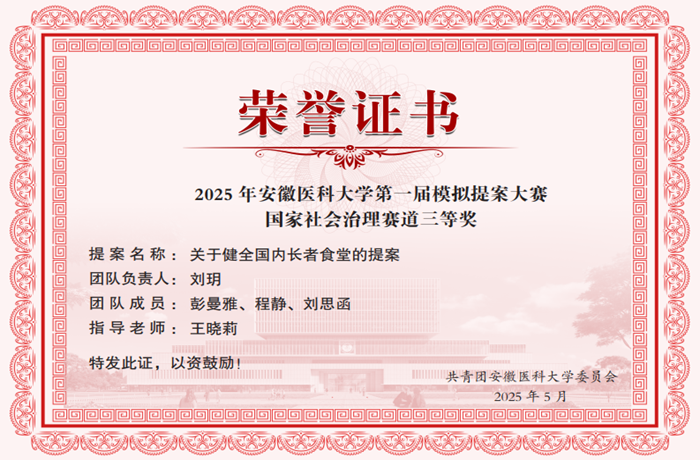 近日,由学校举办的第一届模拟提案大赛落下帷幕。在这场吸引了101支队伍、近500名选手参与,共征集到101件涵盖教育教学、成长成才、医疗健康、乡村振兴等多领域提案作品的赛事中,有20件作品脱颖而出进入校决赛。其中,我院2024级运动康复专业学生刘玥团队提交的《关于健全国内长者食堂的提案》在国家社会治理赛道以第4名成绩斩获获校三等奖。