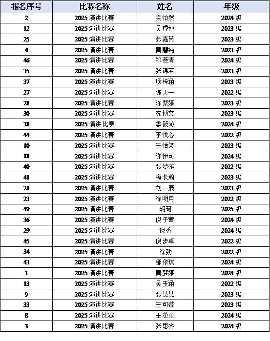 校级决赛定于2025年10月12日(周日)14:00在新校区E202举行,赛制为定题演讲“Strike the Waves”+即兴问答。根据综合表现设特等奖、一等奖、二等奖、三等奖,并拟从中推选2名选手代表学校参加省赛。